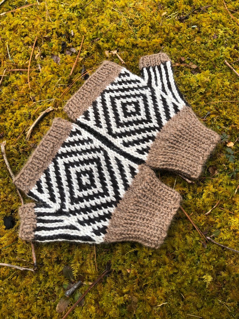 Who couldn’t use something brave and heroic on their hands? These striking fingerless mitts lift spirits with their bold and beautiful geometric patterns! Knit in the round, they feature ribbed cuffs, a gusseted thumb, and bold color work motifs on the palm and back of the hand. The stranded color work creates a super cozy double-layered fabric via the floats that are carried along the inside of the piece. Worked in a 100% alpaca yarn, you’ve got the ultimate in softness, warmth, and wearability! Pair with Dauntless hat, Daring open crown hat, and/or Valiant headband for a cozy matching set!